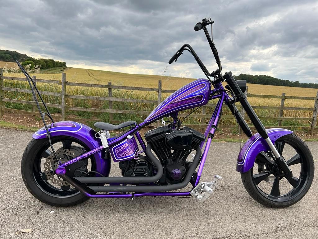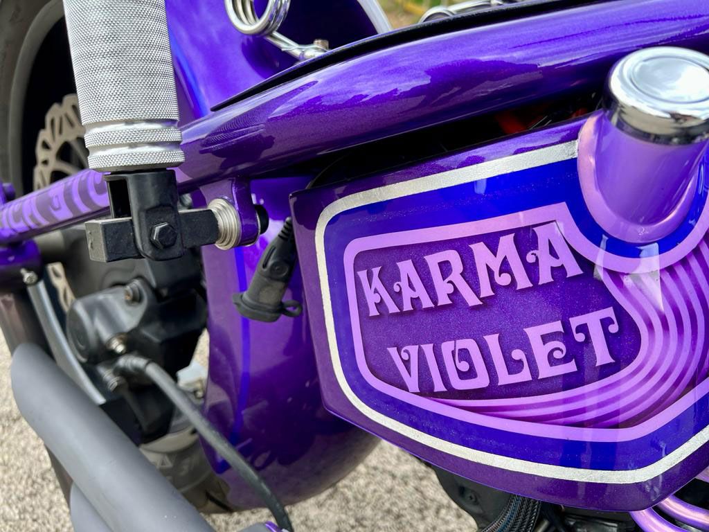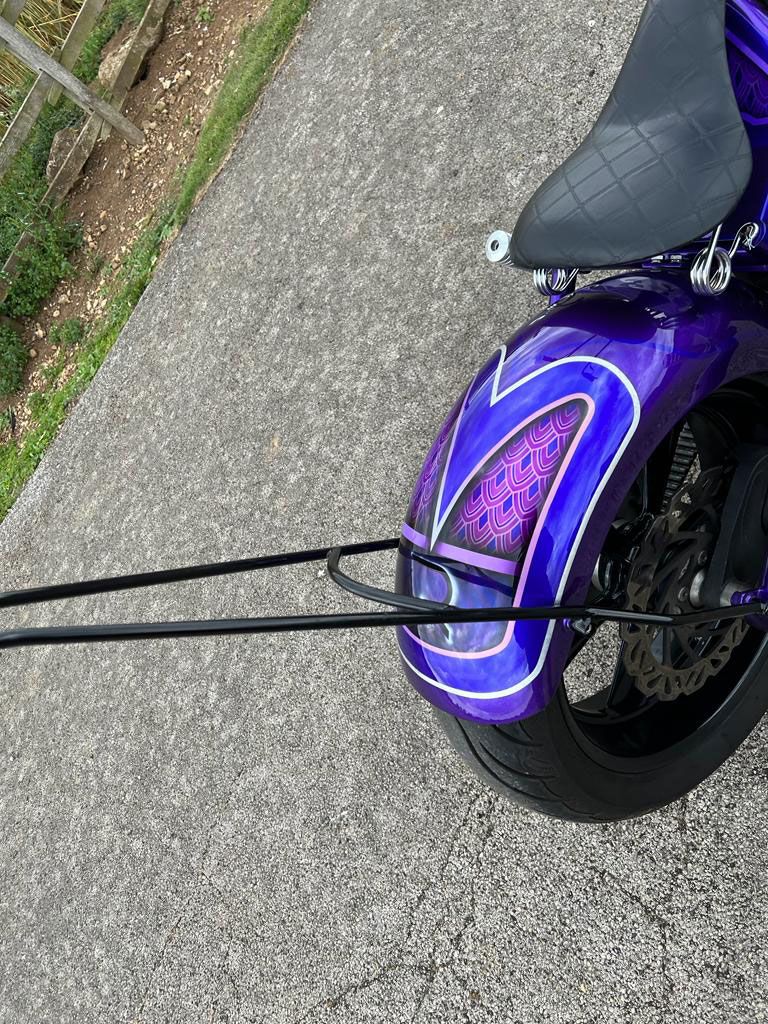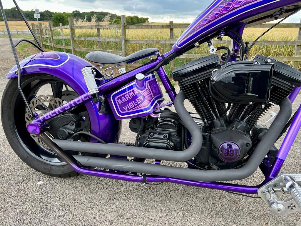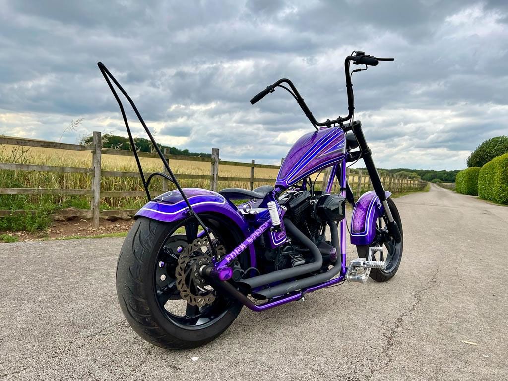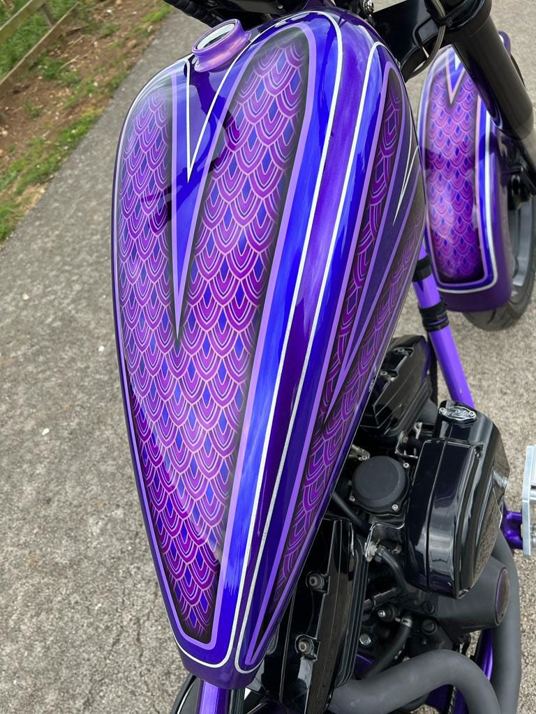 All the paintwork was completed by myself through my business Rebellion Paintworks. Finished in an array of purples: Novak Purple pearlescent, Blueberry Pearlescent, Mystic Purple Metallic, Burple metal flake (ghosted pinstripes). Passion Pearl Purple finally guided in Real silver leaf (stripes) in-house at Rebellion Paintworks. Paints Manufactured and supplied by my friends at ‘Custom Paints’ in Sheffield.